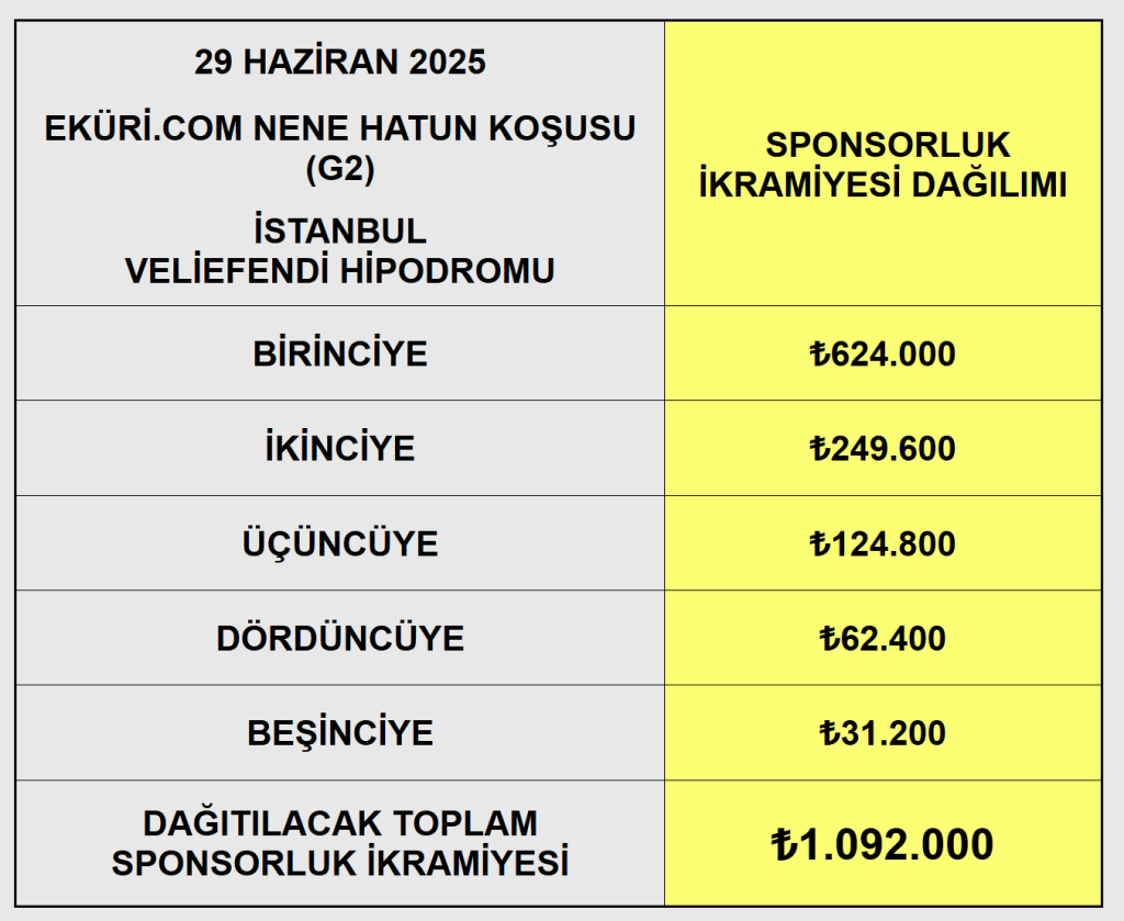 Anlaşmaya göre; 29.06.2025 tarihinde İstanbul’da 3 yaşlı dişi İngiliz taylarının start alacağı 1900 metre çim pistteki Nene Hatun Koşusu (G2) Eküri.com sponsorluğunda gerçekleştirilecek.
